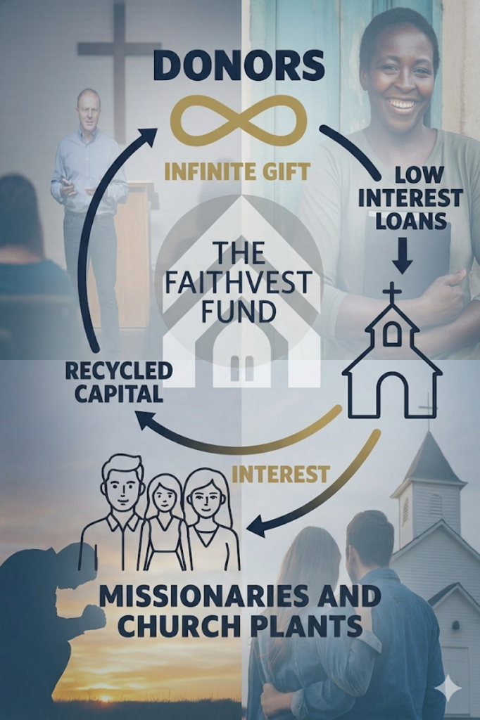 Help churches, missionaries, and church planters in the work of Gospel Expansion by making a gift to The FaithVest Fund. Churches are burdened with high interest mortgages from banks that treat them like for-profit corporations. Instead, The FaithVest Fund offers churches low-interest loans for their construction projects and refinance needs. Churches have more money to reach the people of their community with the Good News of Jesus. And FaithVest gives ALL the interest to missionaries and church planters as grants. Principal gets rolled back into the fund to make new loans to a second, third, fourth church until Kingdom Come!